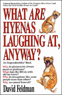 Up until this book, virtually all of my research was done by writing or phoning experts. Hyenas marked the first time I used cyberspace for serious research. What fun to talk to guitarists ("Why do many guitar players leave a long bit of string hanging off in the air at the tuning end of the guitar?"), architects ("Why do buildings have ledges?"), physicists ("Why do two cereal flakes that are floating in milk tend to float toward each other once they get less than an inch apart?"), and conductors ("In marching bands, why are woodwinds placed behind the brass when they are likely to be drowned out by the louder brass?").